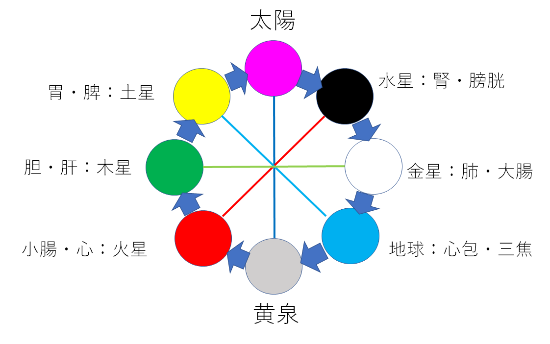 つまり、人体を流れるエネルギーも、太陽(脳)⇨水星(腎臓・膀胱)⇨金星(肺臓・大腸)⇨地球(心包・三焦)⇨火星(心臓・小腸)⇨木星(肝臓・胆嚢)⇨土星(脾臓・胃)と流れていると考えて組み立てたのが七星論です。